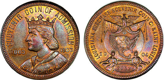 This lovely Louisiana Purchase Expo medal is struck in copper and the reflective surfaces are tinted with beautiful shades of blue, peach, and mangenta.