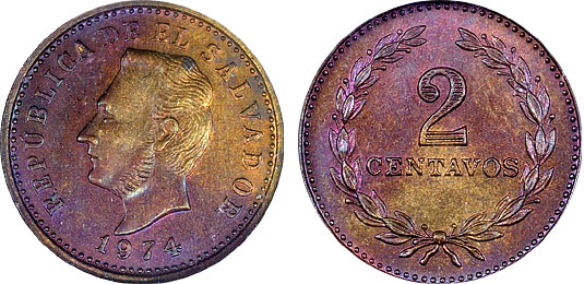 This visually appealing El Salvador 2c is enveloped in a pleasing magenta/purple/blue coloration. This coin was graded MS64 by NGC with certification number 3161417-013.