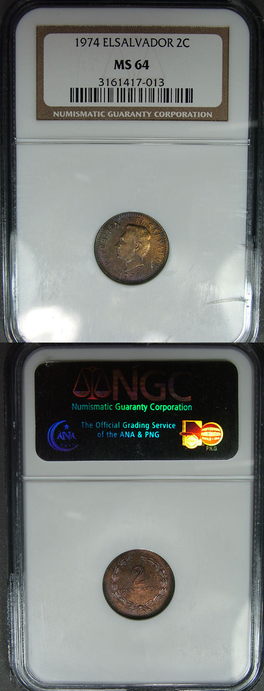 1974 2c NGC MS64 Magenta Purple Toned El Salvador