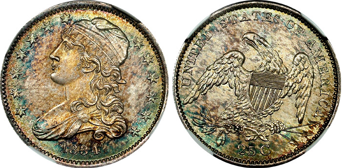 1834 25c NGC MS65 Lustrous Toned Gem Capped Bust Qtr.