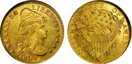 Stunning 1804 $2.5 NGC AU58 Turban Head Quarter Eagle 14 Stars. Orange peel golden surfaces are lustrous and well struck lending to wonderful eye appeal. Adjustment marks are numerous on left lower side of reverse. Interestingly, the reverse die used to produce this coin was also used in the minting of 1804 Dimes. Additionally, the cross-shaped pattern of the stars above the eagle has led numismatists to believe that this die was left over from 1798. A wonderfully rare and desirable piece of yesterday.