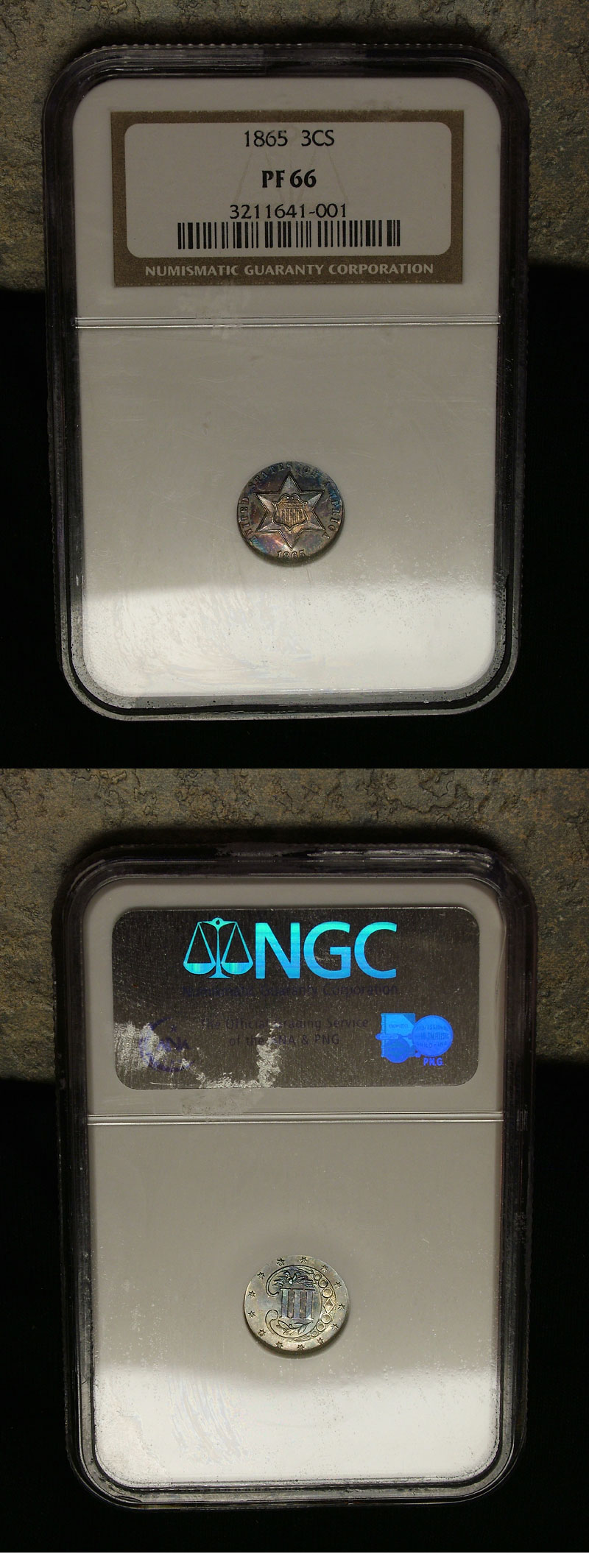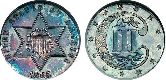1865 3cs NGC PF66 Purple Blue Rainbow Toned Proof Trime