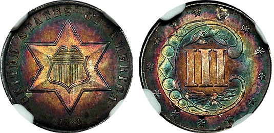 1861 3cs NGC MS63 Rainbow Target Toned Trime