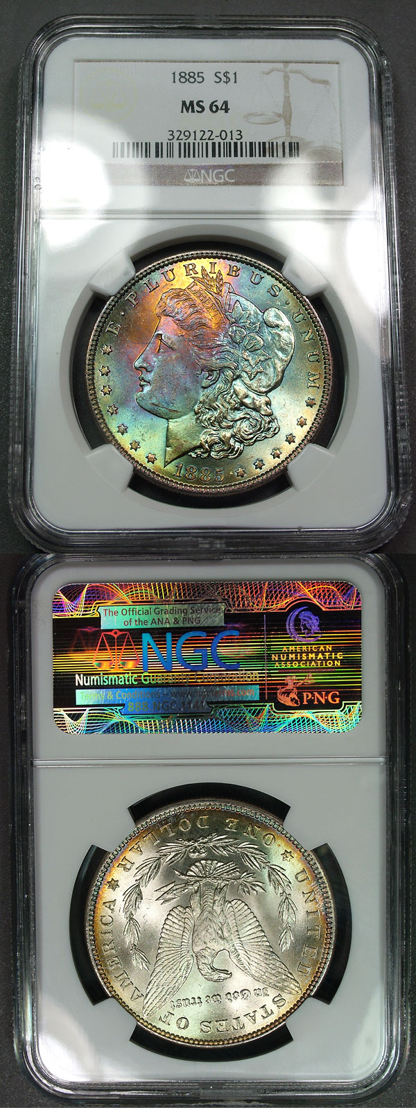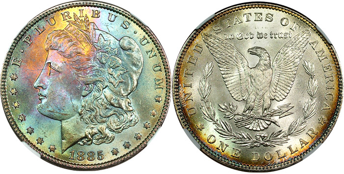 1885 $1 NGC MS64 Sunshine Rainbow Toned Morgan