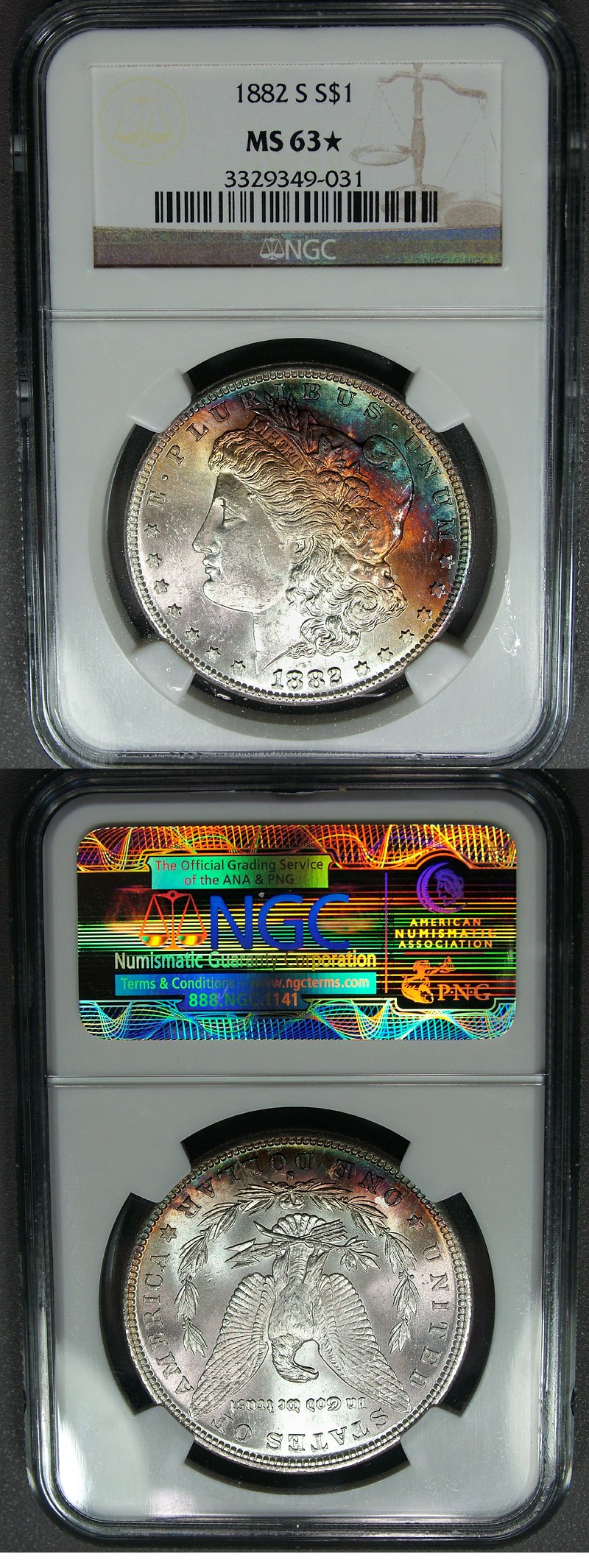 A beautiful rainbow of steel blue, magenta, and burnt orange fall across the upper obverse of this lustrous Morgan dollar. The rest of the surfaces are white lustrous with an exception of the lower reverse featuring a crescent of steel blue and lavender. NGC graded this coin as MS63* STAR with the certification number 3329349-031.