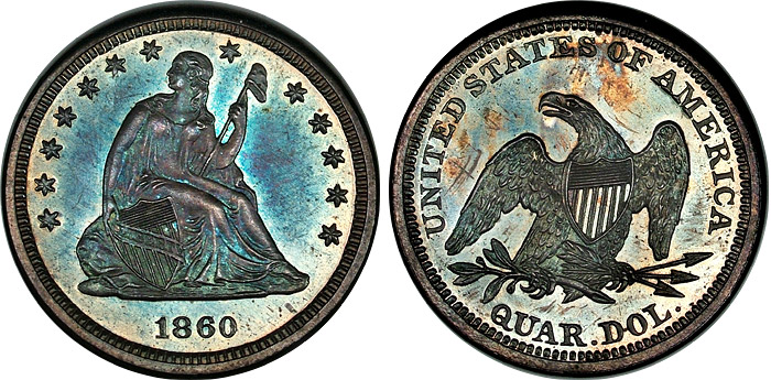 1860 25c NGC PF65 Beautifully Toned Proof Seated Qtr. - CAC