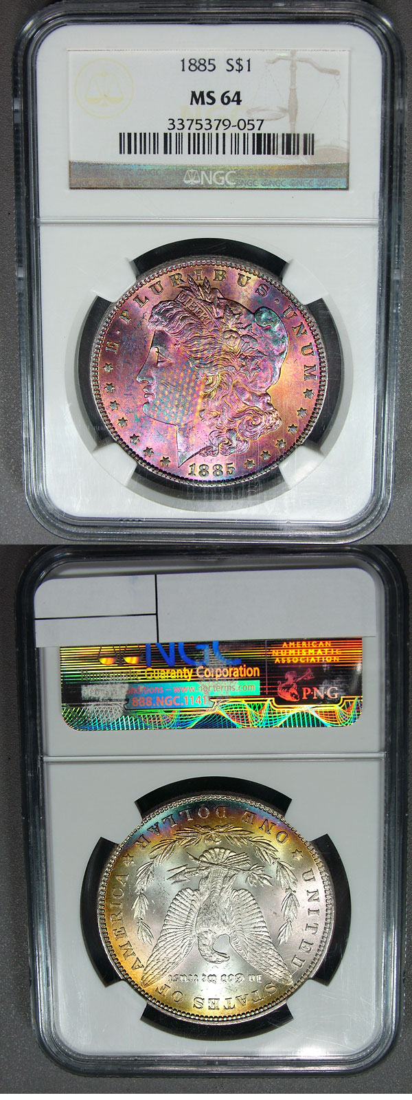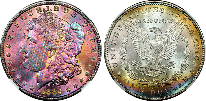 1885 $1 NGC MS64 Textile Toned Morgan - Mauve Freckles