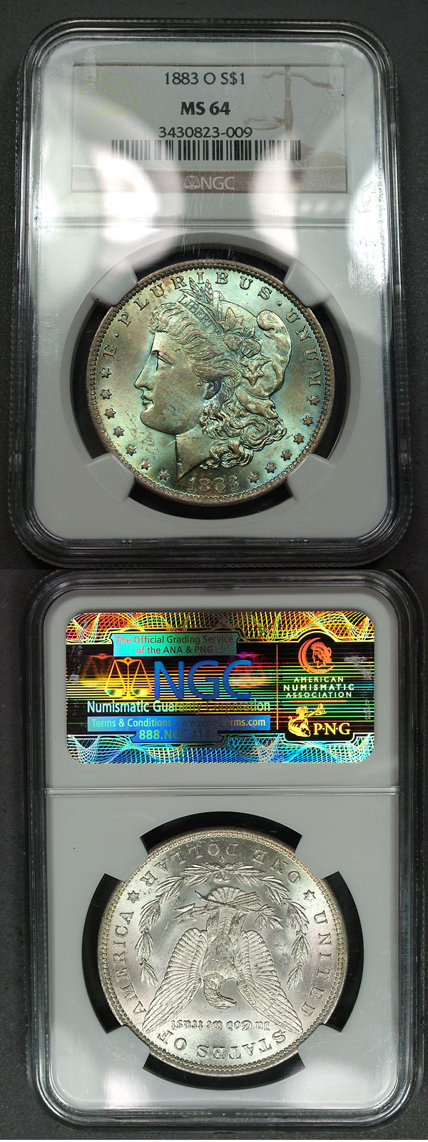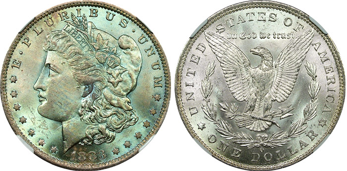 1883-O $1 NGC MS64 Monochrome Textile Toned Morgan