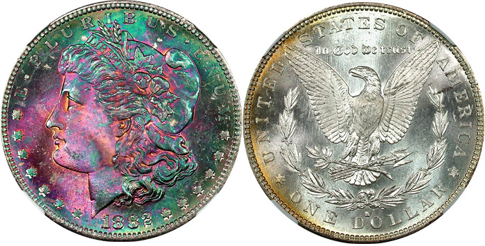 View the largest gallery of high-end and Monster rainbow toned Morgan dollars, an informational guide on how to tell natural vs. artificial toning, learn to price toned Morgans, view auction results of rainbow Morgans, and view what characteristics to look for in high-end toned rainbow Morgan dollars.