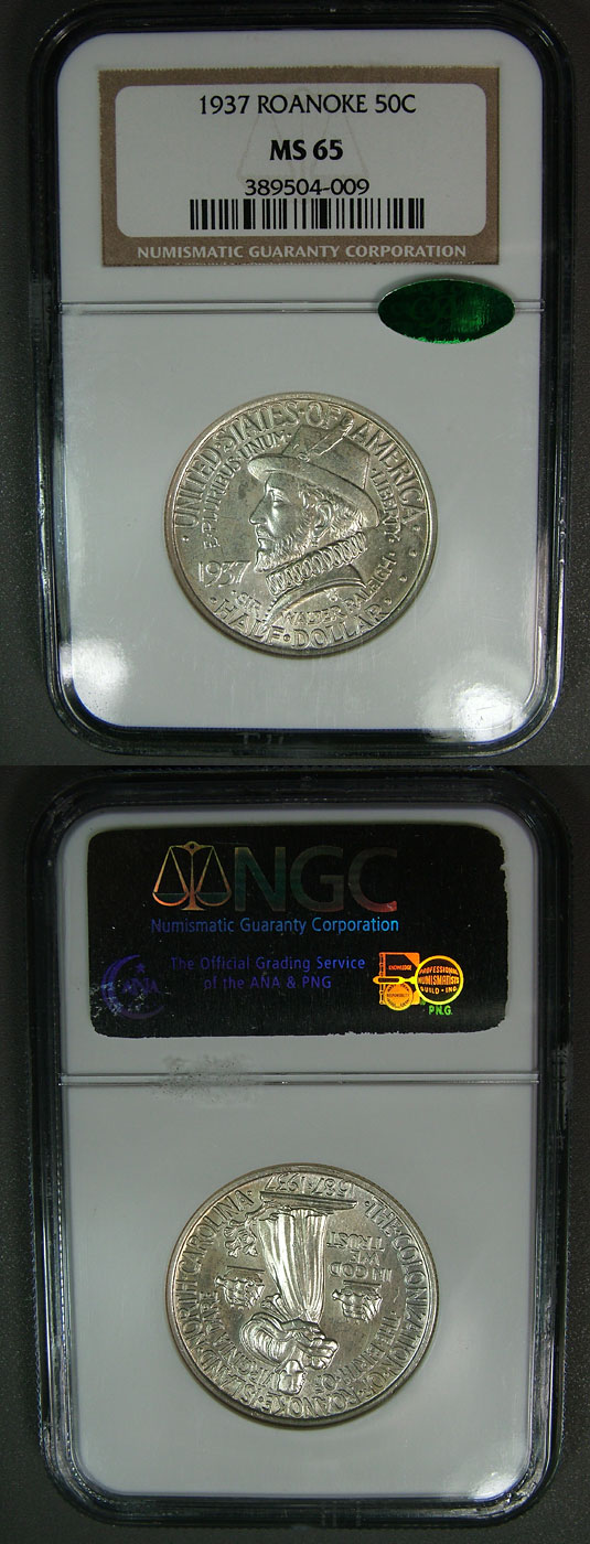 Beautiful 1937 50c NGC MS65 Roanoke Commemorative Half Dollar is near PL and designated "CAC" Frosted devices are swimming in problem free and glassy fields. Nice luster highlights soft subtle sea green and pastel blue tones. Pretty.