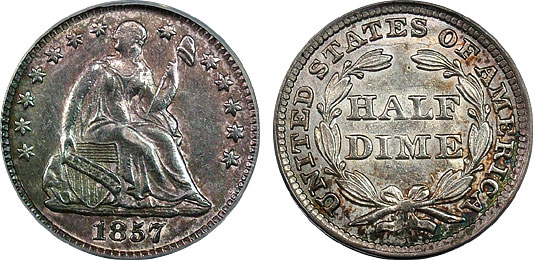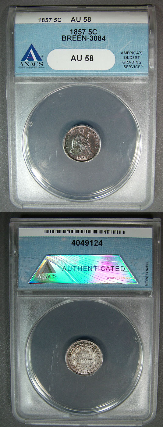 1857 H10 ANACS AU58 Toned Seated Liberty Half Dime