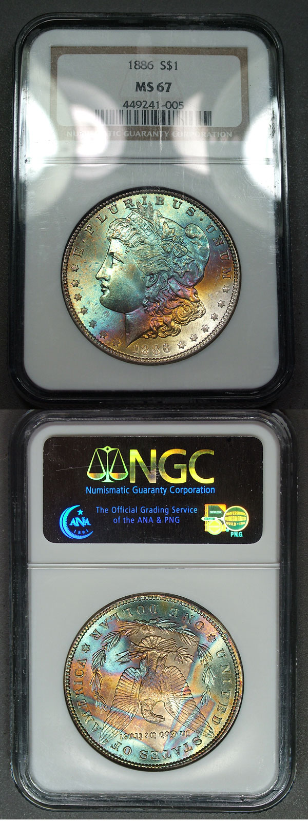 1886 $1 NGC MS67 Rainbow Toned Morgan - Arctic Endroll