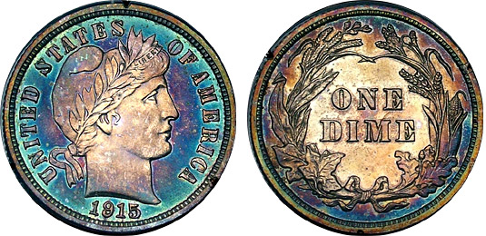 Powerful royal blue and turquoise adorn the obverse fields with magenta near the centers. The reverse is bathed in burnt orange, magenta, and royal blue around the rims. This is one insanely beautiful Proof Barber Dime with deep mirrors in the fields and stunning color throughout.