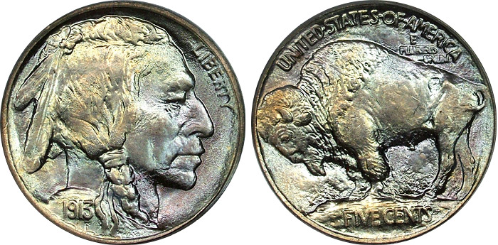 Ice blue is tinted with lime and light gold across both the obverse and reverse of this stunningly lustrous buffalo nickel. This puppy glows and the color is simply beautiful.
