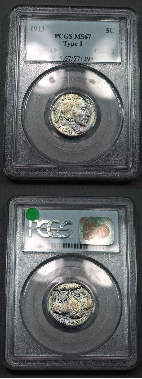 1913 5c PCGS MS67 Type 1 Ice Man Toned Buffalo Nickel