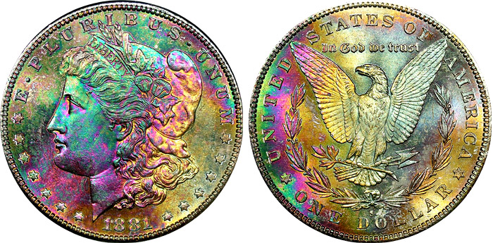 View the largest gallery of high-end and Monster rainbow toned Morgan dollars, an informational guide on how to tell natural vs. artificial toning, learn to price toned Morgans, view auction results of rainbow Morgans, and view what characteristics to look for in high-end toned rainbow Morgan dollars.