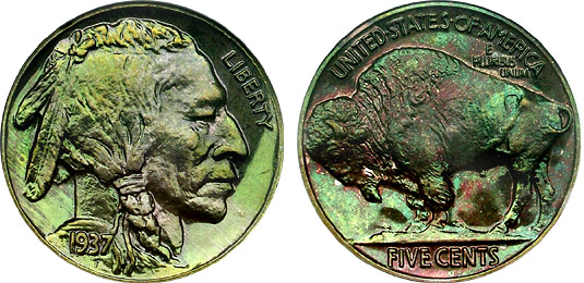Stunning lime green washes over the deeply mirrored brilliant obverse and reverse. The reverse, however, is punctuated with dashes of strawberry pink. This is a very bright coin with excellent mirrors and a powerful proof surface reflectivity. Toned Proof Buffalo Nickels are VERY difficult to find, especially in Premium Gem such as this example. If this coin excites you, take action because this coin will not hang around long and when it is sold, do not expect to see one for quite some time.