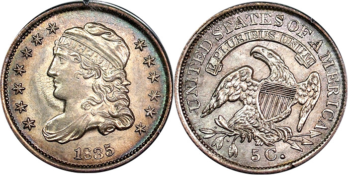 1835 H10c PCGS MS63 Massively Undergraded Rattler Bust Half Dime