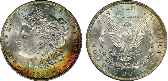 View the largest gallery of high-end and Monster rainbow toned Morgan dollars, an informational guide on how to tell natural vs. artificial toning, learn to price toned Morgans, view auction results of rainbow Morgans, and view what characteristics to look for in high-end toned rainbow Morgan dollars.