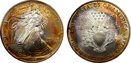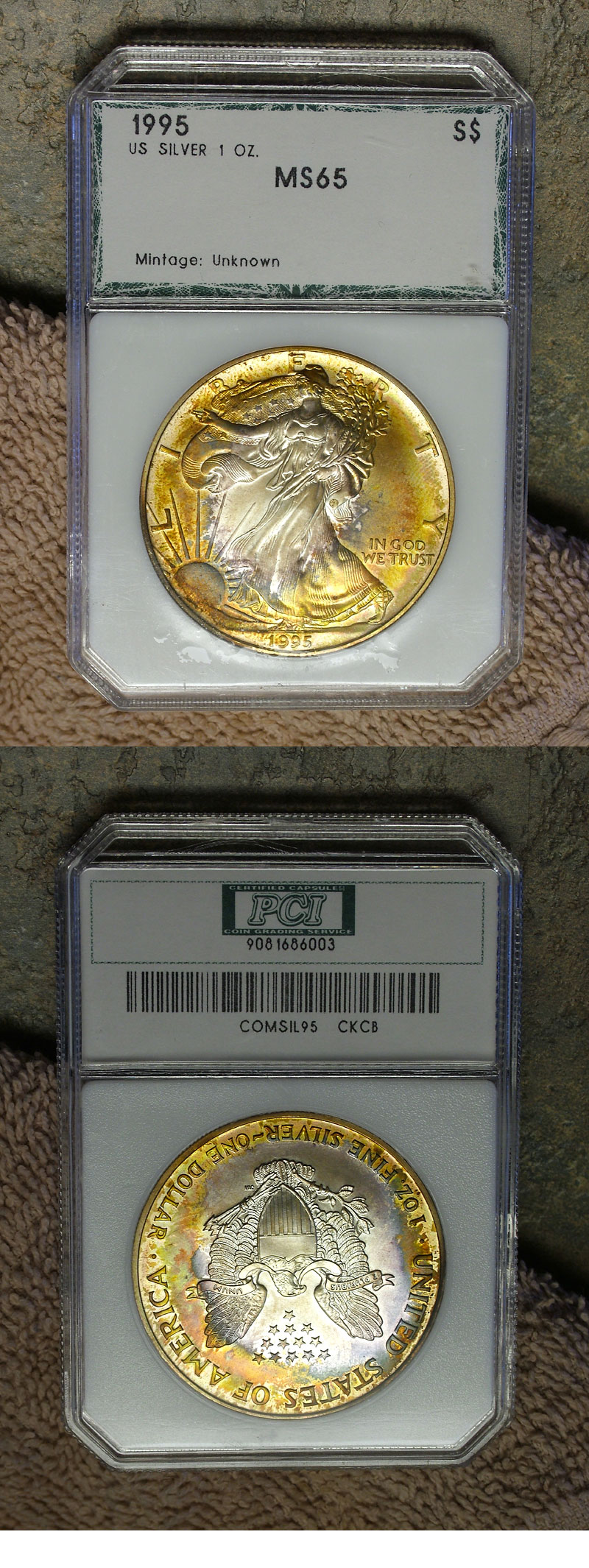 It is a long standing fact that early PCI holders were not inert. In other words, the plastic they were made of interacts with the silver in the coin that is stored in it. This phenomenon is the factor that created the gold-lime-peach rainbow on this Silver American Eagle (SAE).
