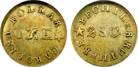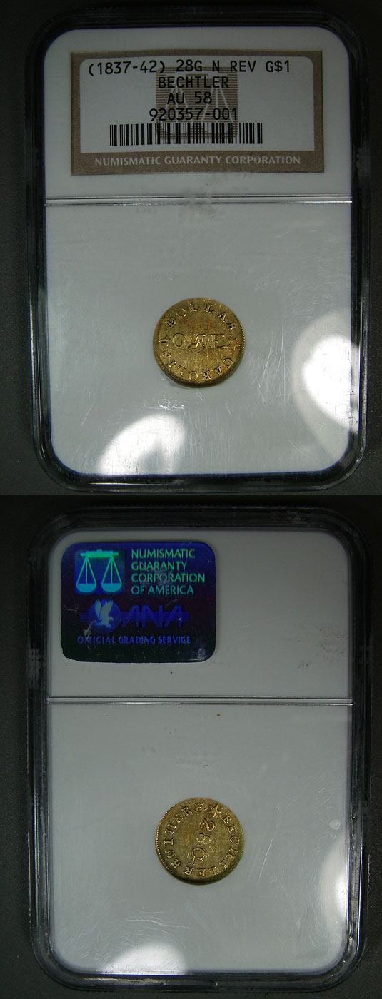 1837-42 $1 NGC AU58 Bechtler Gold Dollar - 28G N Reversed. Beautiful near-mint Bechtler Gold Dollar is toned in a lovely orange peel with strong gold hue. The reserved N is bold and prominent. Incredibly well preserved and rare in this nice a state of preservation. The Bechtler's produced the United States' first gold dollar. The US mint struck their first gold dollar in 1849. The Bechtler Gold Dollar was widely accepted and circulated especially in the Southeast. An impressive piece of numismatic history!