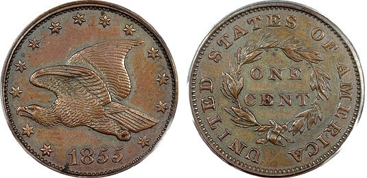 While restrikes exist for this pattern, the present example is an original struck in February 1855. The chocolate brown surfaces are tinted with a light mossy teal in the protected areas. This particular pattern is of great interest and highly collectible to flying eagle cent collectors as it is a spectacular design of the flying eagle style and as an R-5, is attainable in many grades but is extremely elusive with any red on the surfaces. The present example is in an affordable grade as well and it very attractive for a PR-61.
