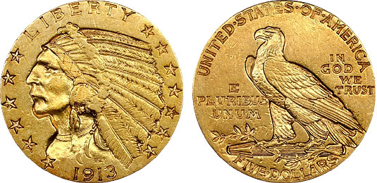 1913-S $5 US High-AU Indian Gold Half Eagle – Better Date