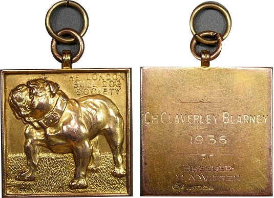 This is a gold medal (hollow) presented in 1936 by the London Bulldog Society Ch. Claverly Blarney to breeder H.A. Wiffen.