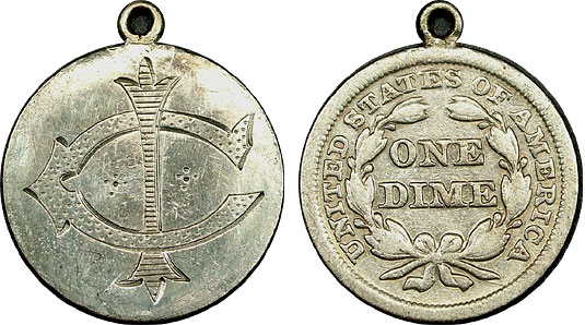 This cute love token is engraved with the initials IC on a silver US Dime and is affixed with a loop for use on a necklace or bracelet.