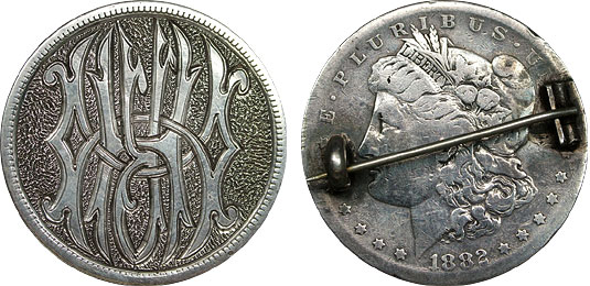 This fabulous Morgan Dollar Love Token features the initials RHH elegantly engraved on the moneyside over a boldly textured field. The reverse has pinback hardware attatched and is still in wonderful working condition.