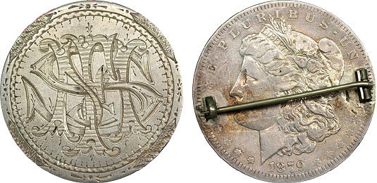 This intricately engraved Morgan Dollar Love Token features the initials FMS in an elegant style accompanied by ornamental engravings. The reverse features a wonderful pinback hardware still in working condition.