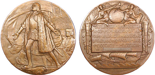 This amazing Columbian Exposition medal was struck in 1893 and was designed by both Charles E. Barber (rev) and Augustus St. Gaudens (obv), two of the most artistic and influential US Mint engravers in history. It was struck in bronze and is 76.2mm in Diameter. It was presented to Nathan Butler and his name is struck into the reverse. Not only is this medal amazing in it''s preservation, it is offered here in it''s original metal blue felt-lined box. You couldn''t ask for a more beautiful medallic historical representation of the World''s Columbian Exposition.