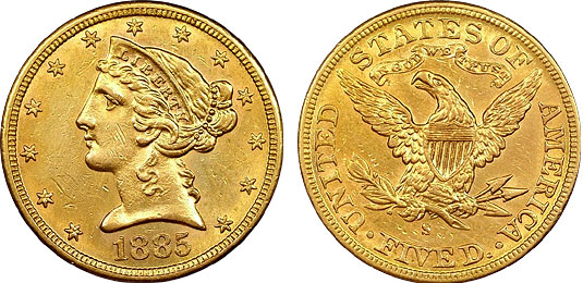 This medium gold Liberty half eagle shows evidence of a light wiping on the obverse and exhibits only light wear overall in choice AU condition.