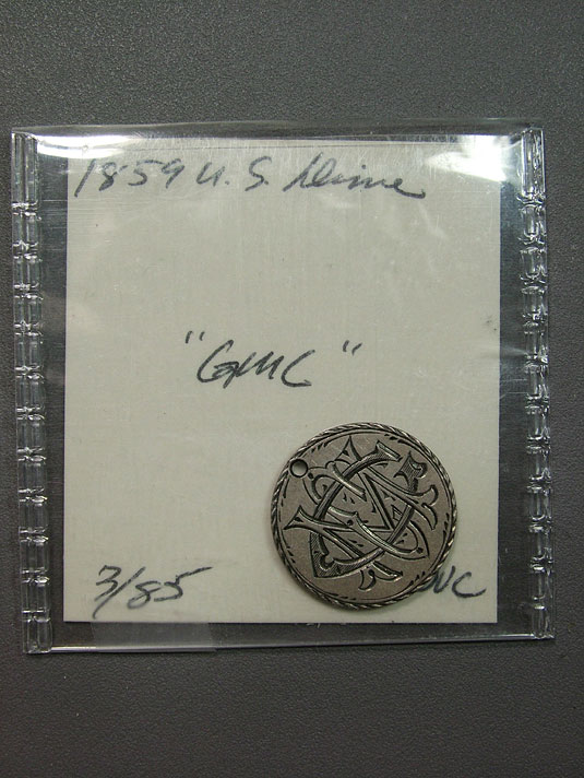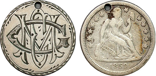 1859 U.S. Seated Dime Love Token Engraved - GMC. Maybe you are an employee of the General Motors Corporation or, more possibly, named Gertrude Maryweather Collins, this piece might be of some interest to you. It is holed for a necklace.