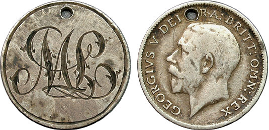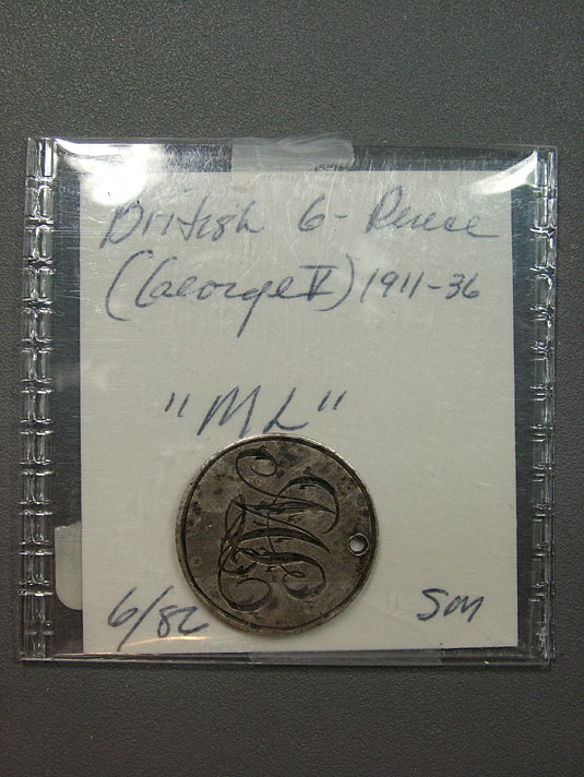 British 6 Pence George V 1911-36 Love Token Engraved - ML. This is a beautifully engraved love token with a nice origianl patina and a loop for a necklace.