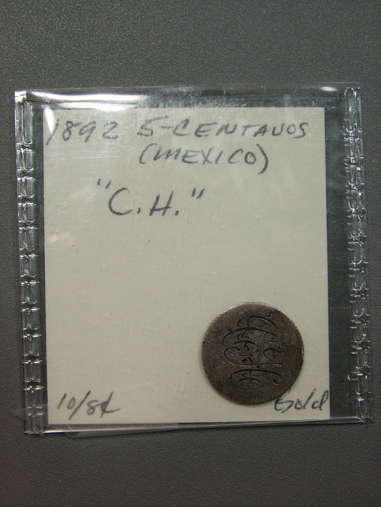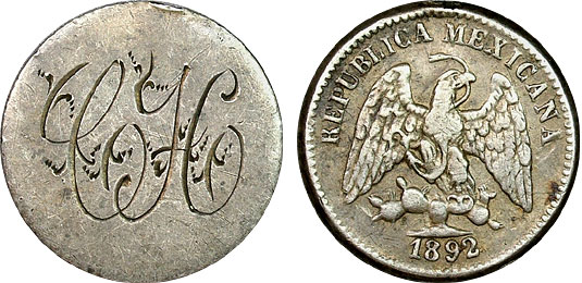 1892 Mexico 5 Centavos Love Token Engraved - CH. I could honestly see a Chavez Hernandez owning this. Yes, I believe I could. Anyway, this is a lovey token that is engraved in a very delicate design and sure to please those of an asthetic eye.
