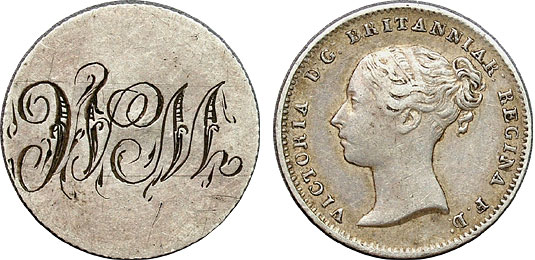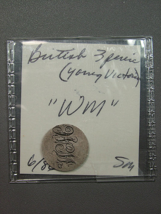 British 3-Pence Love Token Engraved - WM. Wacky Momma, Wicked-Mobile, Wacky Macky, Want Me?, White Man (I'm not racist, if there was a BM, I'd say Black Man, geez), Willfully Mundane, and Won't Matter. There, I sparked your imagination. Now go through the rest of my listings and come up with your own acronym!