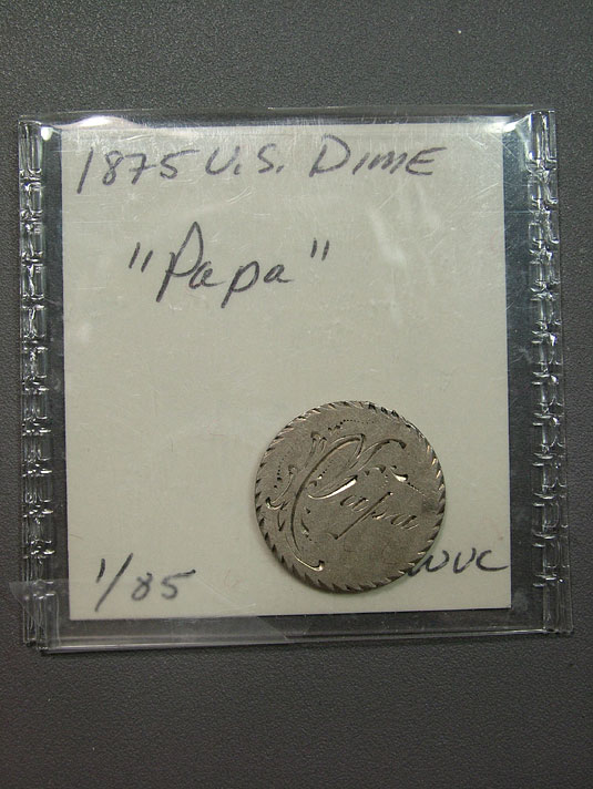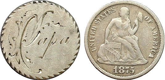 1875 U.S. Seated Dime Love Token Engraved - Papa. This love token is engraved in an attractive script pattern.