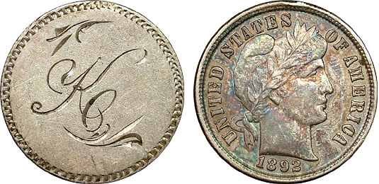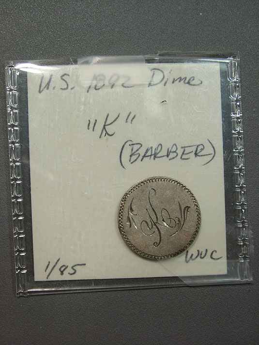 1892 U.S. Barber Dime Love Token Engraved - K. An attractive script K is engraved on this simple and appealing love token.
