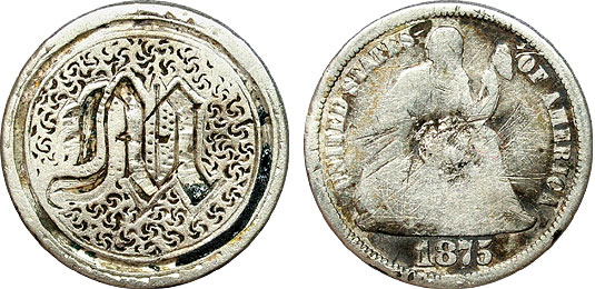 1875 U.S. Seated Dime Love Token Engraved/Enamelede- "M" Lovingly etched into this heavily circulated Seated Dime and protected with enamel, this is one pretty love token! I just hope you know a "M" worthy of this charming and historic piece.
