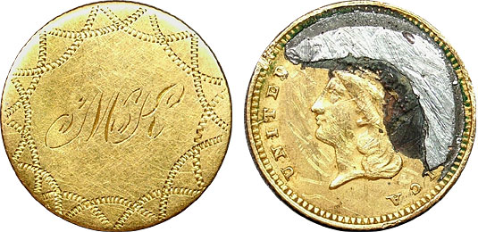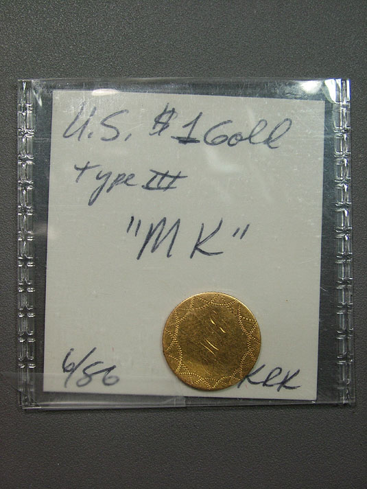 U.S. Type III Gold Dollar Love Token Engraved - "MK" Behold a new star in the sky... this lovely type III gold dollar is dazzling with etched star rim design and the initials "MK" on the reverse. The obverse is a bizarre combination of Miss Liberty in her golden glory and a scraped out, burnt field to her left.