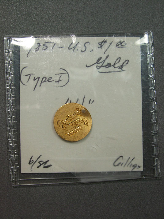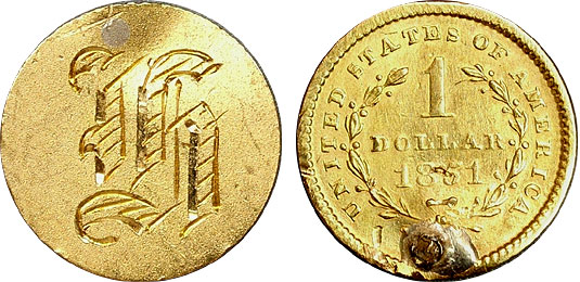 U.S. Type I Gold Dollar Love Token Engraved - "H" Still flashy and lovingly engraved with "H" this is one appealing love token! The reverse, infact, exhibits original luster in protected areas and she was plugged under the wreath at 6 o'clock. A tough life these love tokens lead!