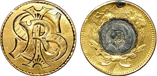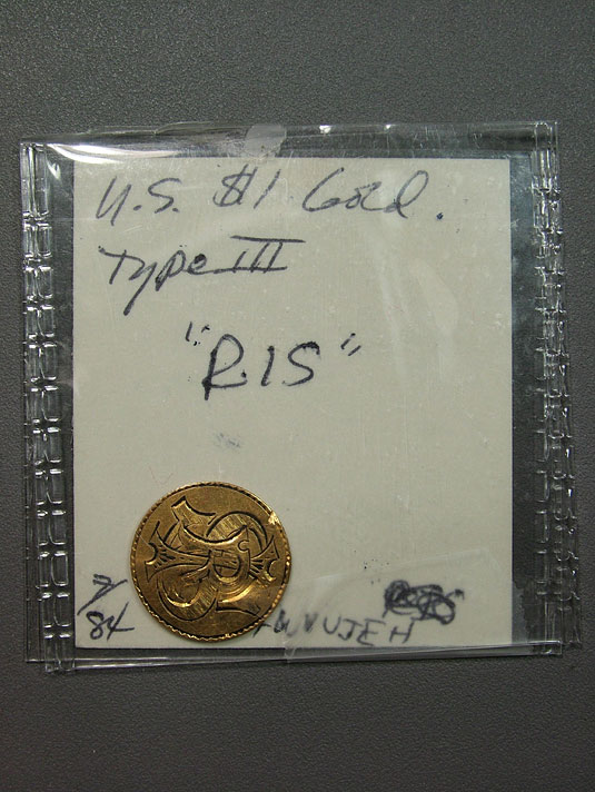 U.S. Type III Gold Dollar Love Token Engraved - "RIS" Bold, sharp, appealing... all these things and more would desribe the engraving. The flip side was soldiered, perhaps to a button at one point. Great eye appeal.