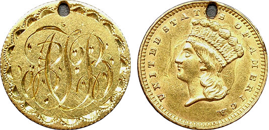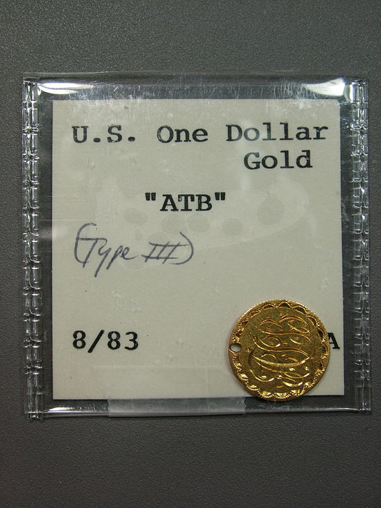 U.S. Type III Gold Dollar Love Token Engraved - "ATB" Still showing flash after all these years this lovely type III gold dollar is engraved in an elegant victorian script. Some of the engraving clashes through to obverse which is still quite sharp and appealing.