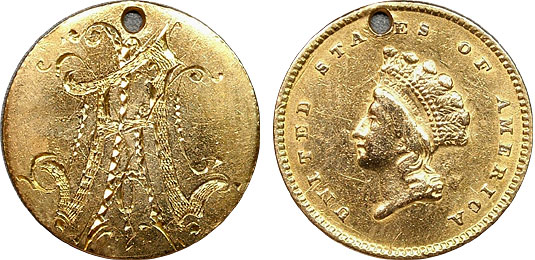 U.S. Type III Gold Dollar Love Token Engraved - "ATB" Holed as a once member of the charm necklace movement this lovely type III gold dollar just wants to fill in the void. Won't you help her?