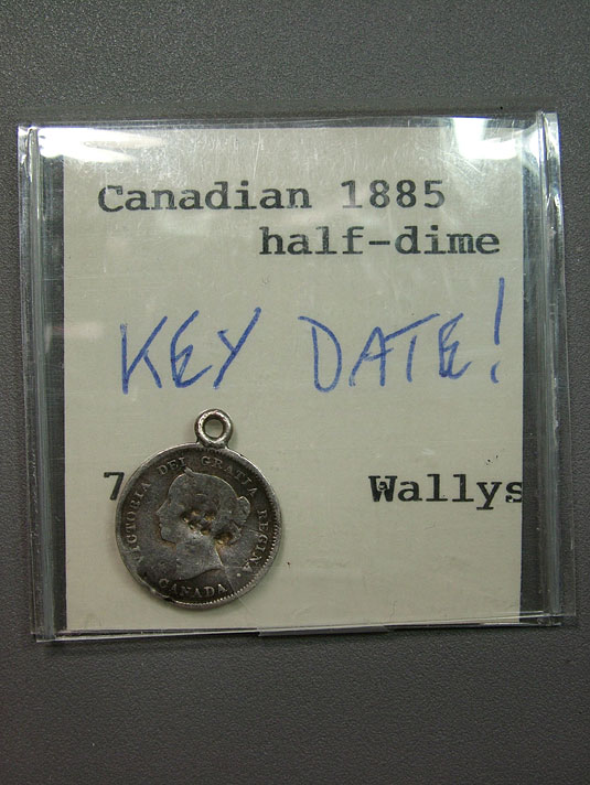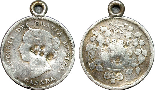 1885 Canadian Half Dime Love Token Looped - Key Date! An unfortunate fate for such a desired coin. A loop soldiered to the top of the coin for a necklace. This now love token charm is a key date Canadian Half Dime and should still be desired in her diminished state.