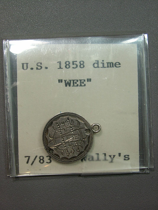 1858 U.S. Seated Dime Love Token Engraved - "WEE" Immaculately engraved reverse is stunningly appealing. An absolute gem of a love token. Interestingly WEE is a network online where you can meet new friends. This token would certainly be quite the conversation starter!