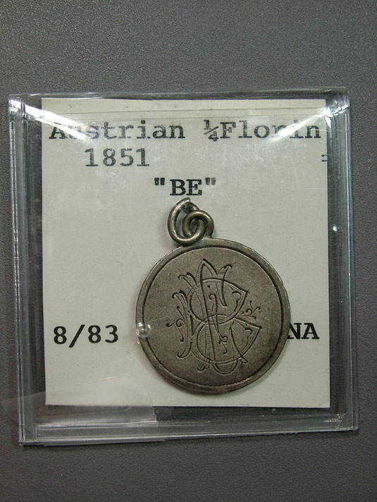 1851 Austrian Quarter Florin Love Token Engraved - "BE" A neat example with a loop at the top for a necklace. A very pretty charm and desirable love token especially those with an interest in Austrian history.