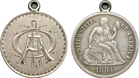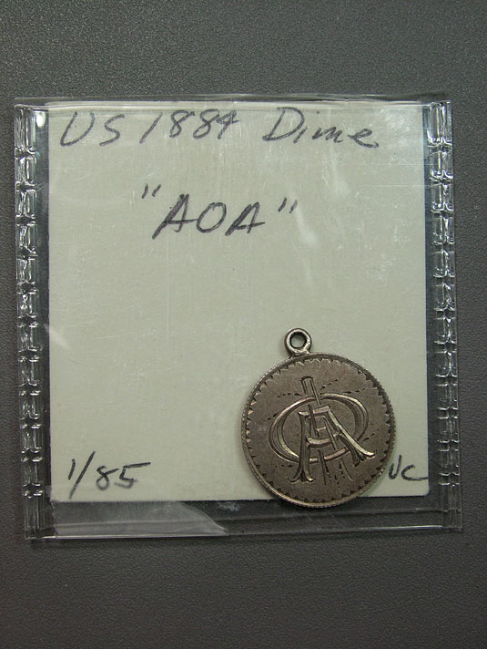 1884 U.S. Seated Dime Love Token Engraved - "AOA" A collective dropping of the heart at the thought this beautiful Seated Dime just might have been minted in San Francisco!? Perhaps that is why this love token has found her way into your hands and not around the neck of a love laid to eternal rest. She must have been a collector of the finer things!