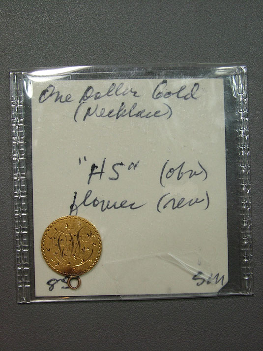 U.S. Type I Gold Dollar Love Token Engraved - HS, Flowers. Some men will stop at nothing to win the affection of their loved one. A beautiful US gold dollar, her initials engraved "HS" and a wonderfully bold flower on the opposite side. A classy and loving tribute sure to impress your favorite Lady.